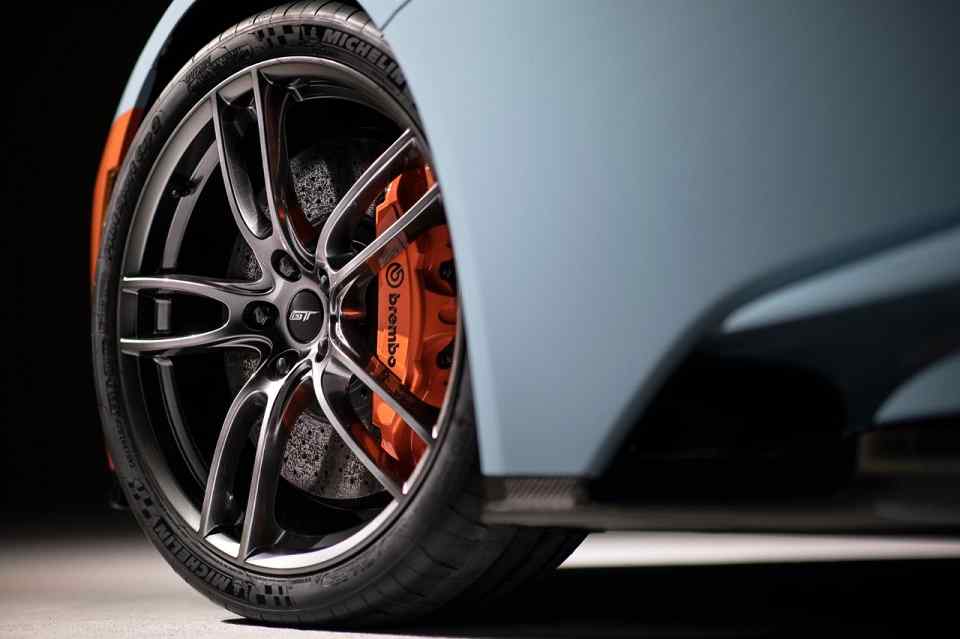 The special Gulf Oil tribute package for the Ford GT Heritage Edition features the blue and orange hues of the original. The scheme also includes exposed carbon fiber A-pillars and 20-inch forged aluminum wheels. Orange calipers and silver rear view mirror covers round out the exterior design.