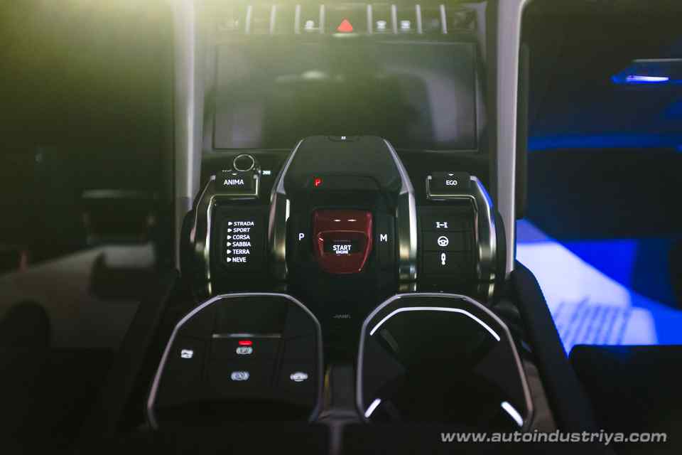 A central mounted shifter is flanked by mode selectors. Selectable driving modes are: Strada, Sport, Corsa, Sabbia (Sand), Terra (Off-Road), and Neve (Snow).