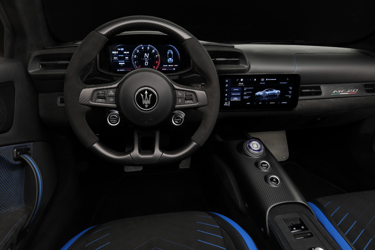 A fully-digital instrument panel, as well as a D-cut steering wheel, greet drivers when they first enter the MC20. Meanwhile, sport bucket seats, neat touches of leather, and Alcantara, along with carbon fiber trim, further give the MC20 its sporting pedigree.