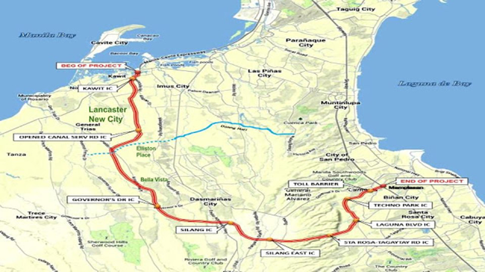 DPWH Secretary Mark Villar stated that the 18-kilometer CALAX will have eight interchanges and one main toll barrier. When completed, CALAX is expected to cut travel time between CAVITEX and SLEX by 45 minutes.