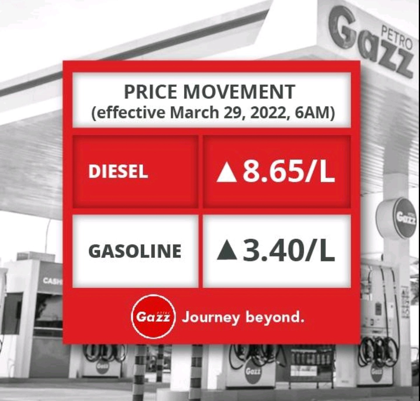 Pilipinas Shell has announced that beginning 6:00 AM, March 29, they are implementing an increase of PHP 9.40 per liter of kerosene, PHP 8.65 per liter of diesel, and PHP 3.40 per liter of gasoline. PetroGazz also released a fuel price advisory together with CleanFuel, and will be making the same adjustments on their diesel and gasoline products by 6:00 AM and 8:01 AM tomorrow, respectively.