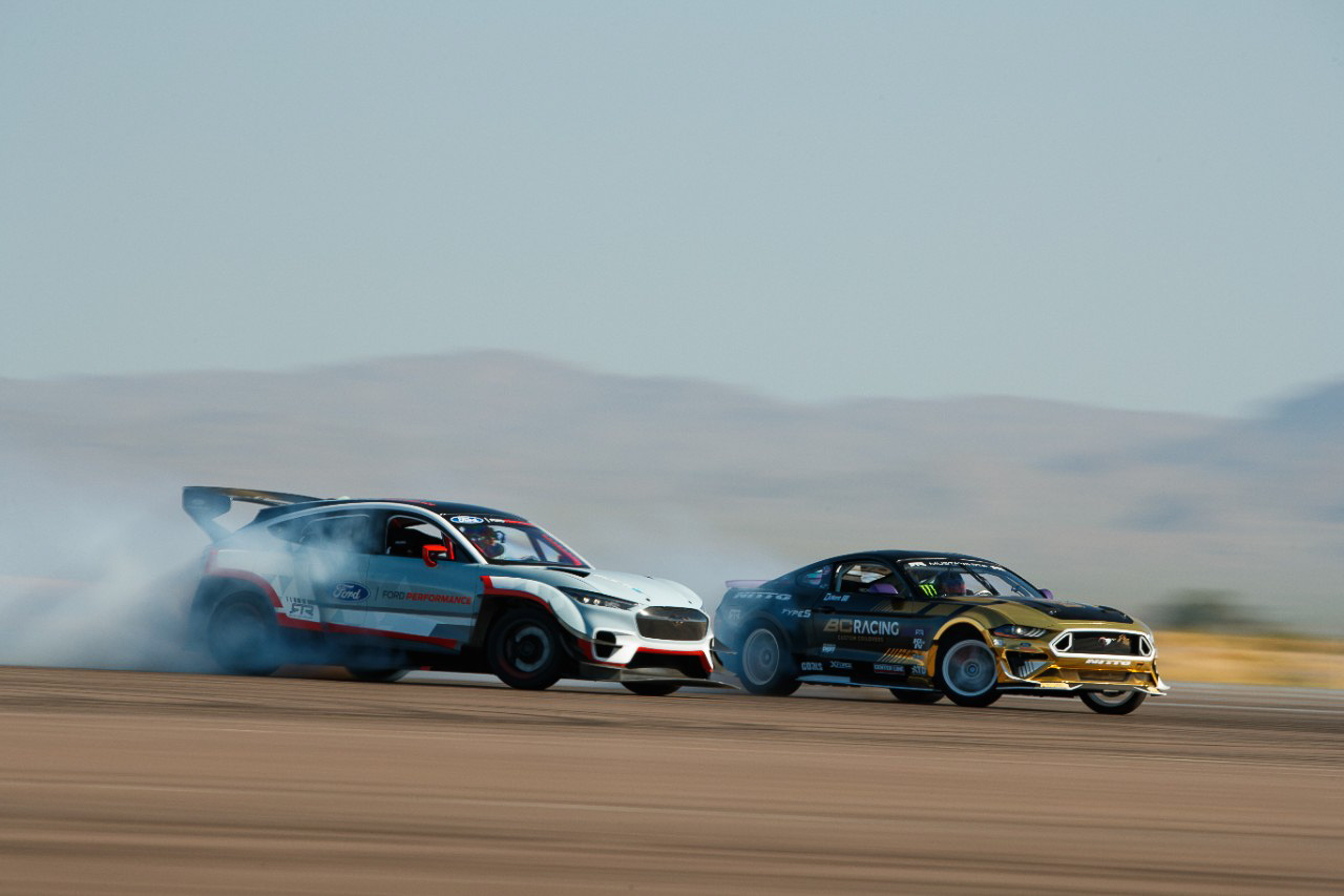 Are you still having doubts about the Mustang Mach-E 1400's capability to make that much power? Watch the video and see professional drifter Vaughn Gittin Jr. get to grips with the 'screaming' 1,400 HP Mustang Mach-E Prototype alongside its V8 stablemates.