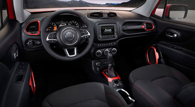 The interior of the Renegade has a 'Tek-Tonic' design theme that is defined by the intersections of soft and tactile forms with rugged and functional details. The instrumental cluster are intersected with functional panels such as the passenger handle. It also has 'protective clamp fasteners' and an anodized design accents. The interior of the vehicle also features an open-air roof panel system that enables passengers an open-air feel when opted.