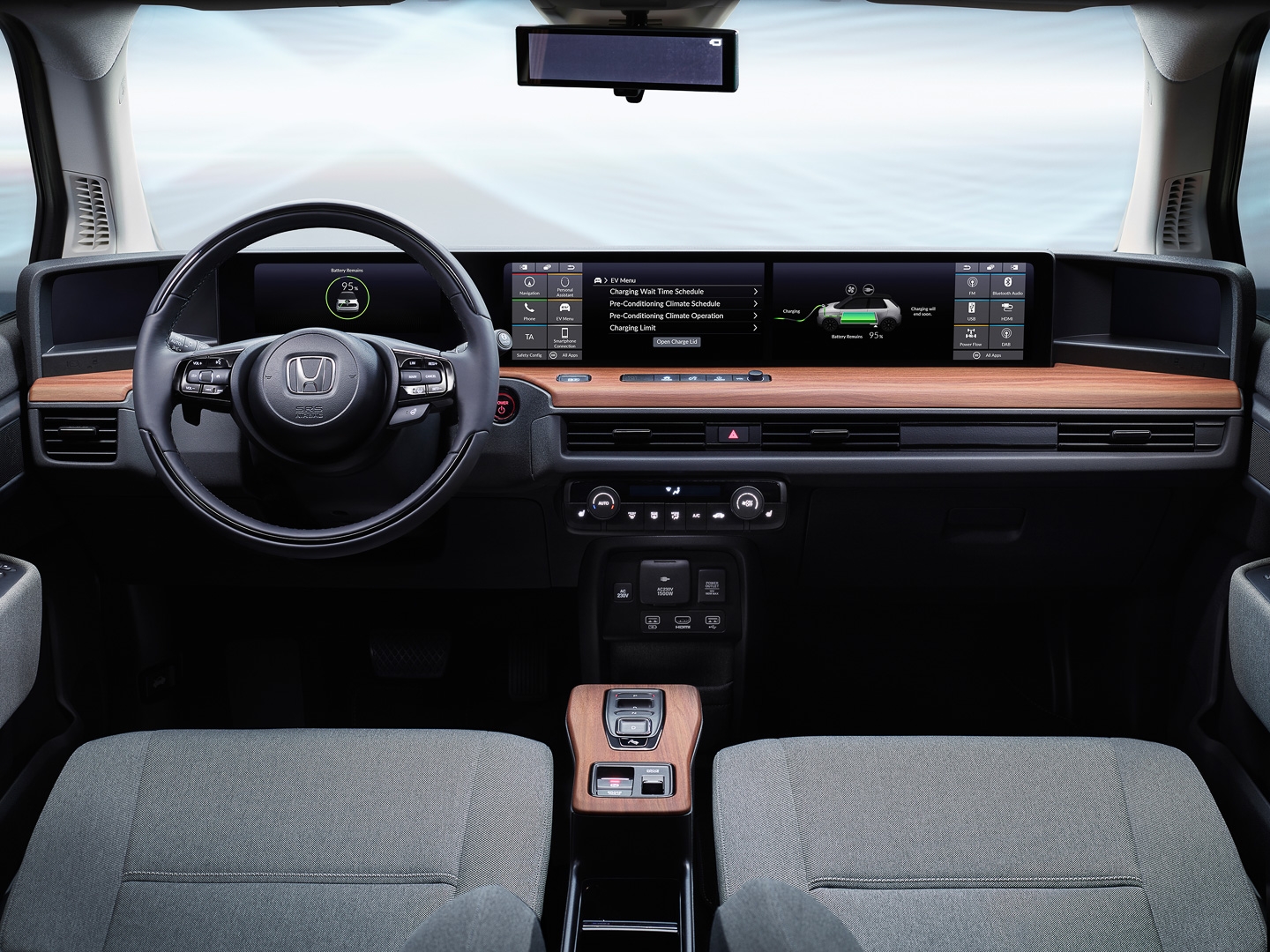 Honda released images of the e Prototype's interior, showing a cabin that supposedly creates a lounge-like feel; the company used sofa fabrics and materials that are normally used in homes. The e Prototype has a dual screen set up on the dashboard, and can be customized depending on the driver's needs with a variety of apps and connected services. The rear view mirror also uses a camera.