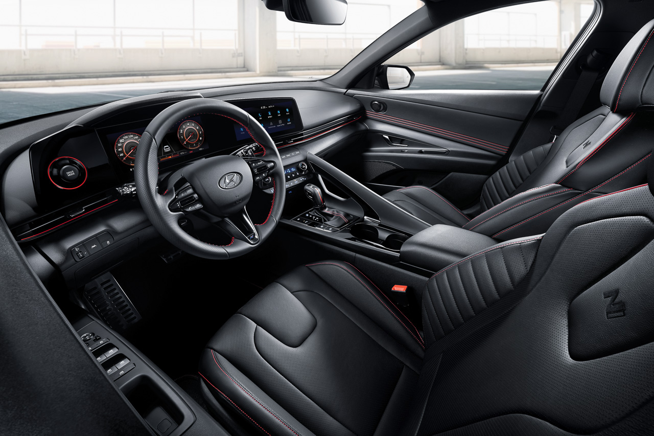 As for the interior, it gets N Sport seats with leather bolsters, a leather-wrapped N steering wheel, alloy pedals, metal accents on the gear shifter, and paddle shifters for the dual-clutch variant. Like the standard Elantra, two 10.25-inch screens are present inside the sedan. The first screen serves as an instrument panel, while the other screen is the touchscreen infotainment system.