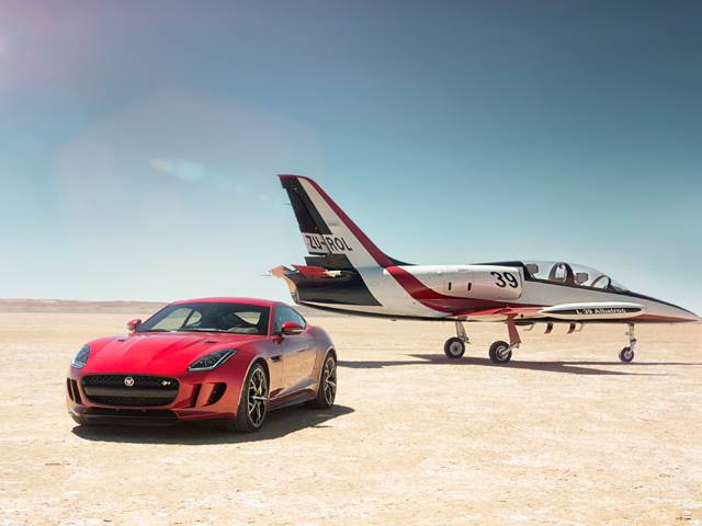Carrying out key communications testing, the Jaguar F-Type R Coupé fitted with radio equipment ran on the Hakskeen Pan desert in the Northern Cape of South Africa at a top speed of 299 km/h. A jet using the same radio frequency travelled just 50 feet above at a speed of 804 km/h. Even at the combined speed of almost 1127 km/h, communications was established successfully. This proves that with a similar setup, the Bloodhound Supersonic Car (SSC) will be able to keep in touch with the ground crew when it attempts to break the 1228 km/h world land speed record by going for nearly 1610 km/h.