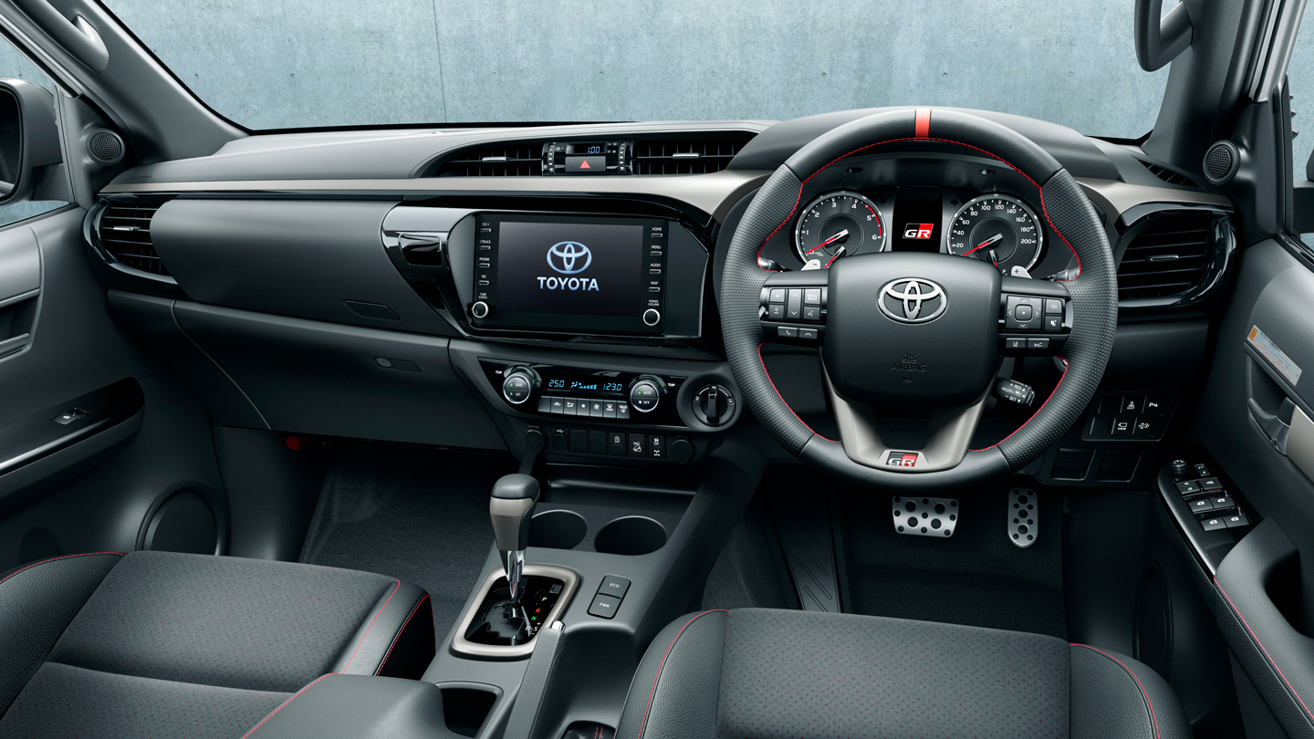 Step inside the Japan-spec Hilux GR Sport, and it's very much the same as the Thai-spec pickup truck. There are sports seats lined with leather and GR logos embroidered on the headrests. Other GR-branded bits include a steering wheel, start/stop button, gauge cluster, and aluminum pedals.