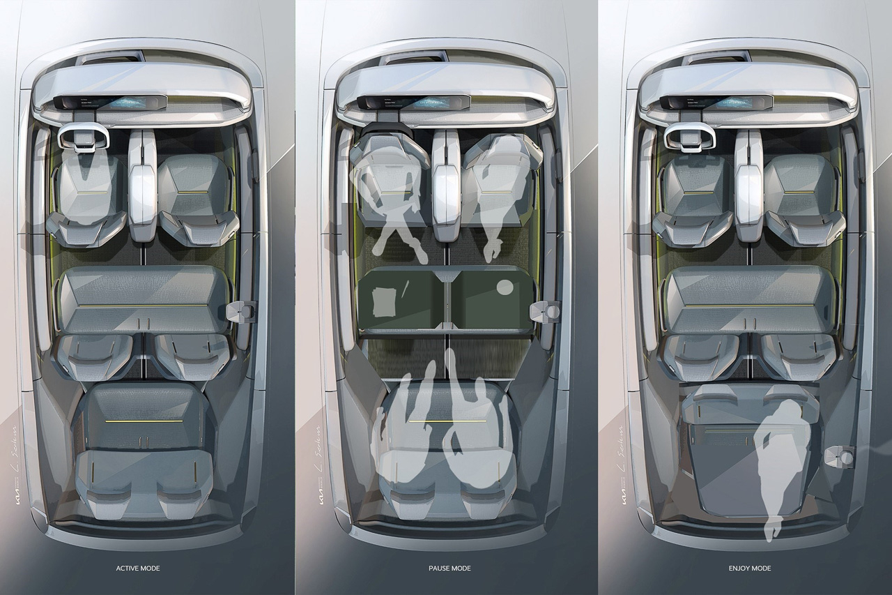 The second mode is called Pause which transforms the interior into a lounge. In this mode, the seats switch around to enable occupants seated in the first-row and third-row to face each other. Meanwhile, the second-row seats fold down and become a table – completing the first-class lounge arrangement.