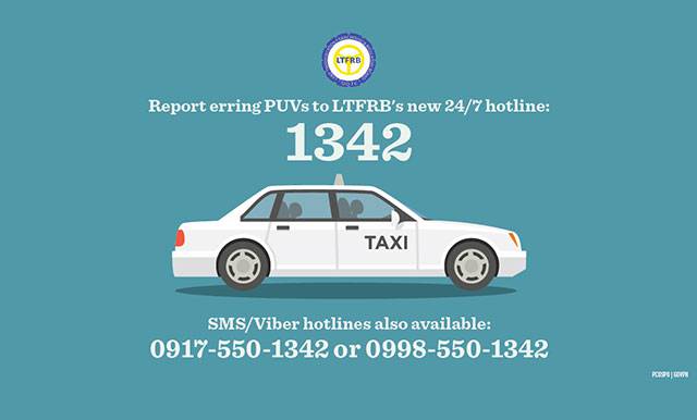 The Land Transportation Franchising and Regulatory Board has launched a new 24/7 hotline number. To report delinquent public utility vehicles (PUVs), commuters are urged to dial 1342. The LTFRB says that all complaints pertaining to erring PUV drivers and operators such as arrogant drivers, defective taxi meters, hit and run incidents and reckless driving will be entertained. The hotline is currently operational nationwide.