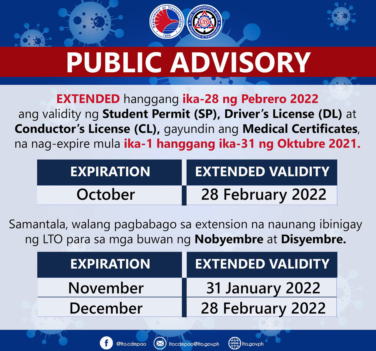 According to the government agency, the validity of DLs and SPs that expired last October 2021 has been extended until February 28, 2022. Moreover, the LTO said that medical certificates that expired from October 1 to October 31, 2021, are still valid until February 28, 2022.