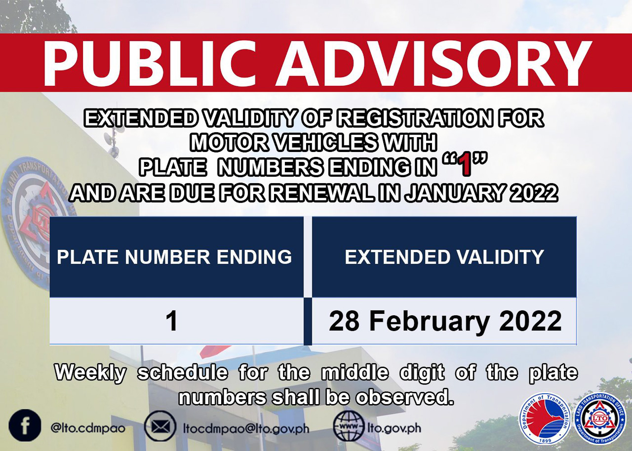 Aside from extending the validity of DLs and SPs, the LTO shared that the motor vehicle (MV) registration for cars with plate numbers that end in "1" will be valid until February 28, 2022. This will give affected motorists more time to schedule their renewal amid the ongoing pandemic.