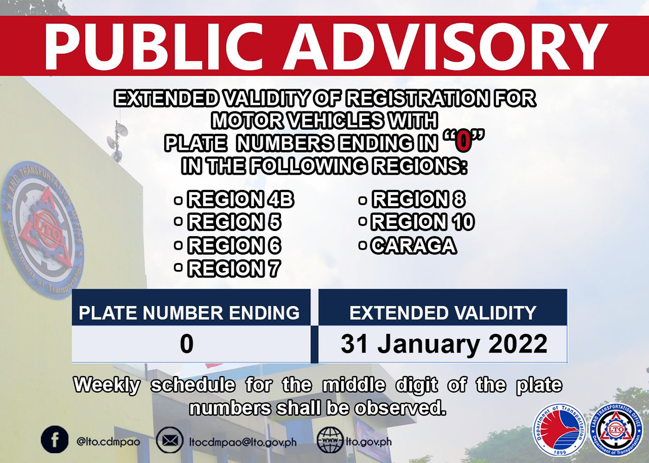 Last but not least, the MV registration of vehicles with plate numbers that end in 0 has been extended until January 31, 2022. However, this extension is only available for cars registered in Region 4B, Region 5, Region 6, Region 7, Region 8, Region 10, and CARAGA.