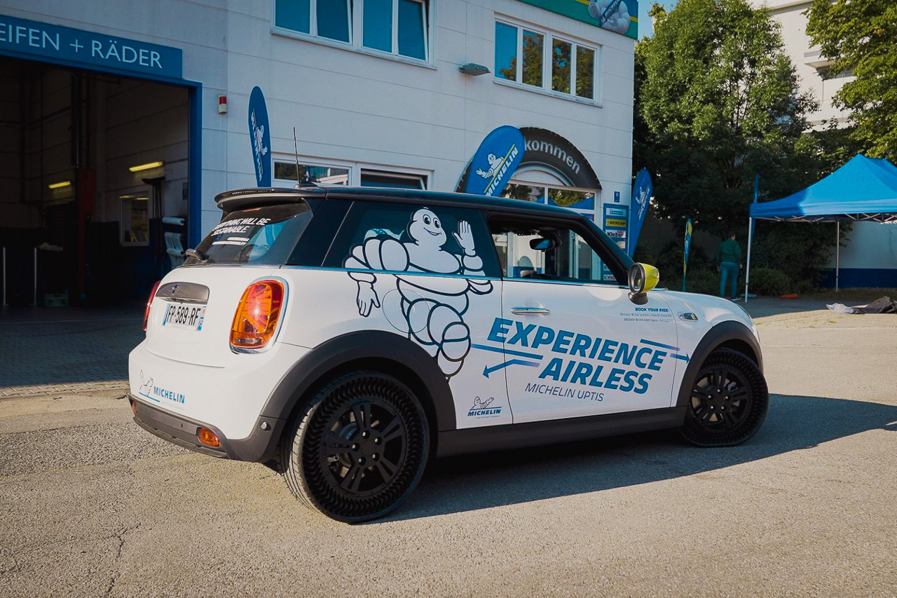 At this year's International Motor Show Germany (IAA), Michelin announced that the Uptis is on track for its market introduction in 2024. To prove that it's on its way, the French tire maker publicly demonstrated its capabilities at the show. Using a Mini Electric as a demo car, lucky showgoers were able to see and experience for themselves the new airless tire.