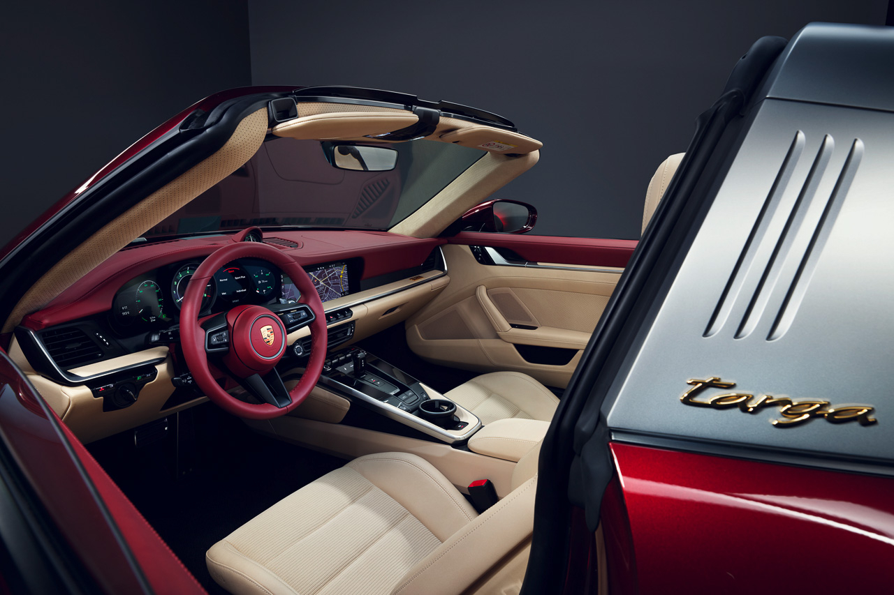 Starting on the outside, it is finished in either this exclusive Cherry Metallic paint or four other exterior colors; and is accented with gold badges, to give it a 1950s feel. The spear-shaped livery on the front fenders serves as a throwback to the early days of Porsche motorsports.