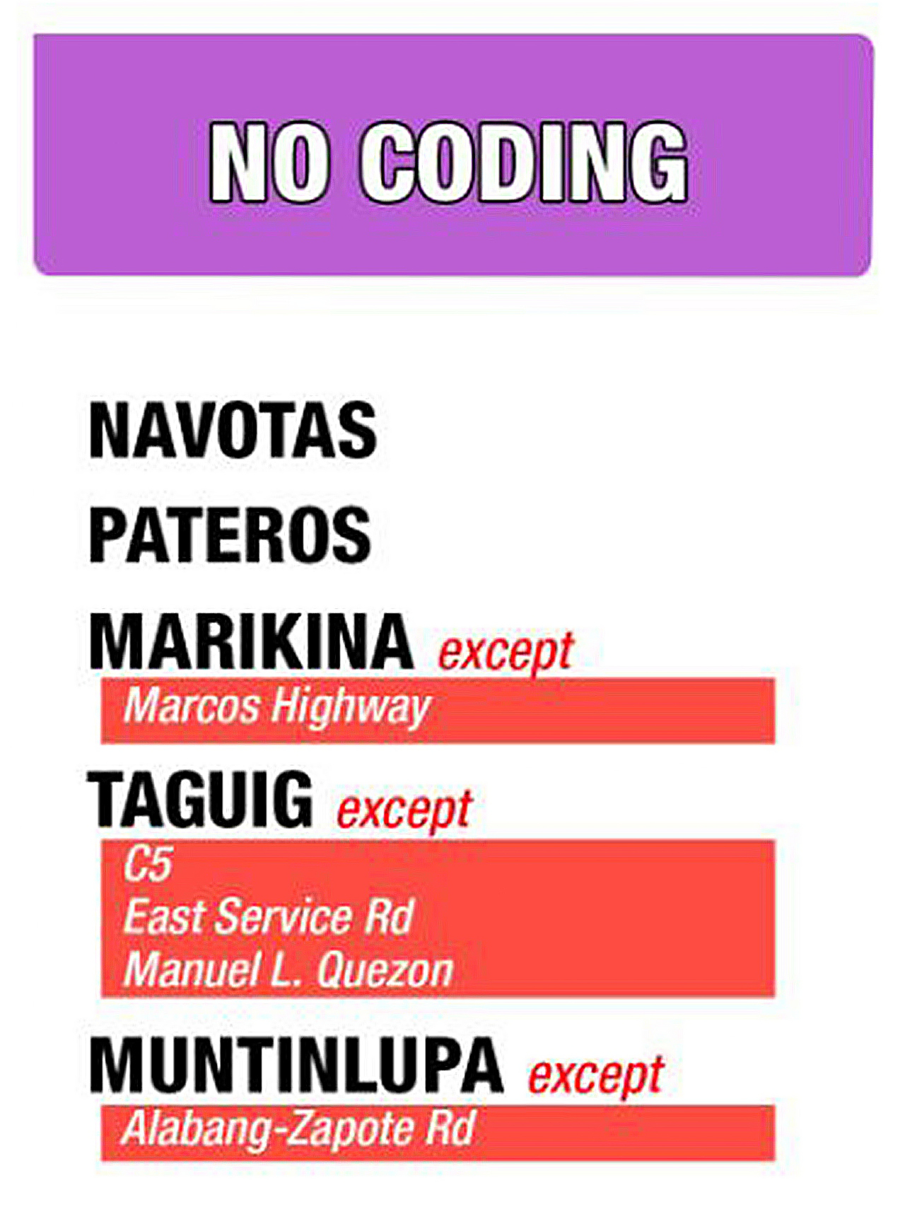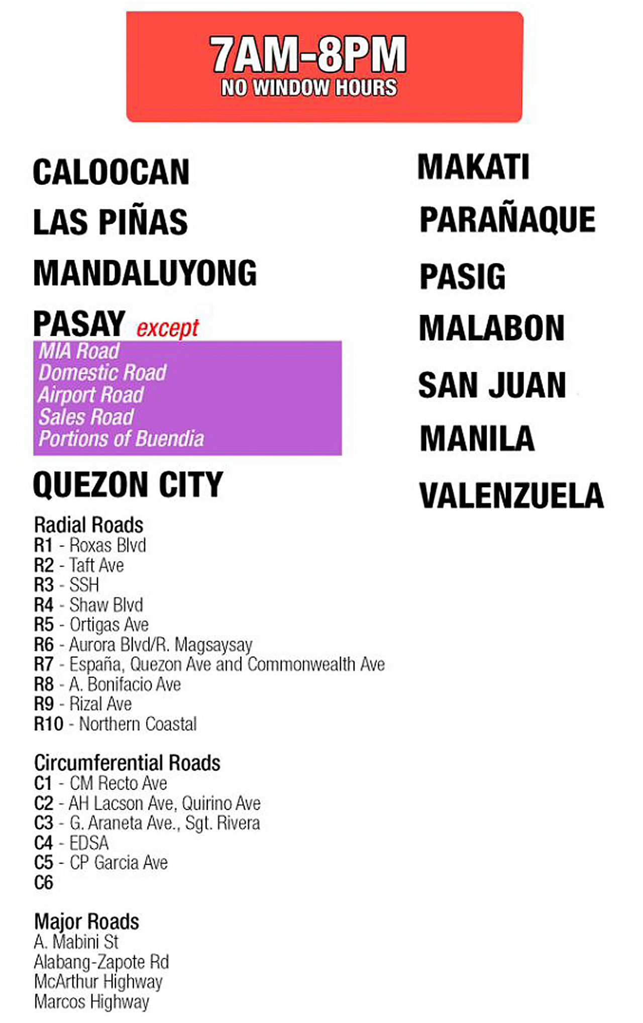 The above-mentioned roads within the city of Pasay may be used anytime while all thoroughfares in the others cities are off-limits while coding hours are in effect.