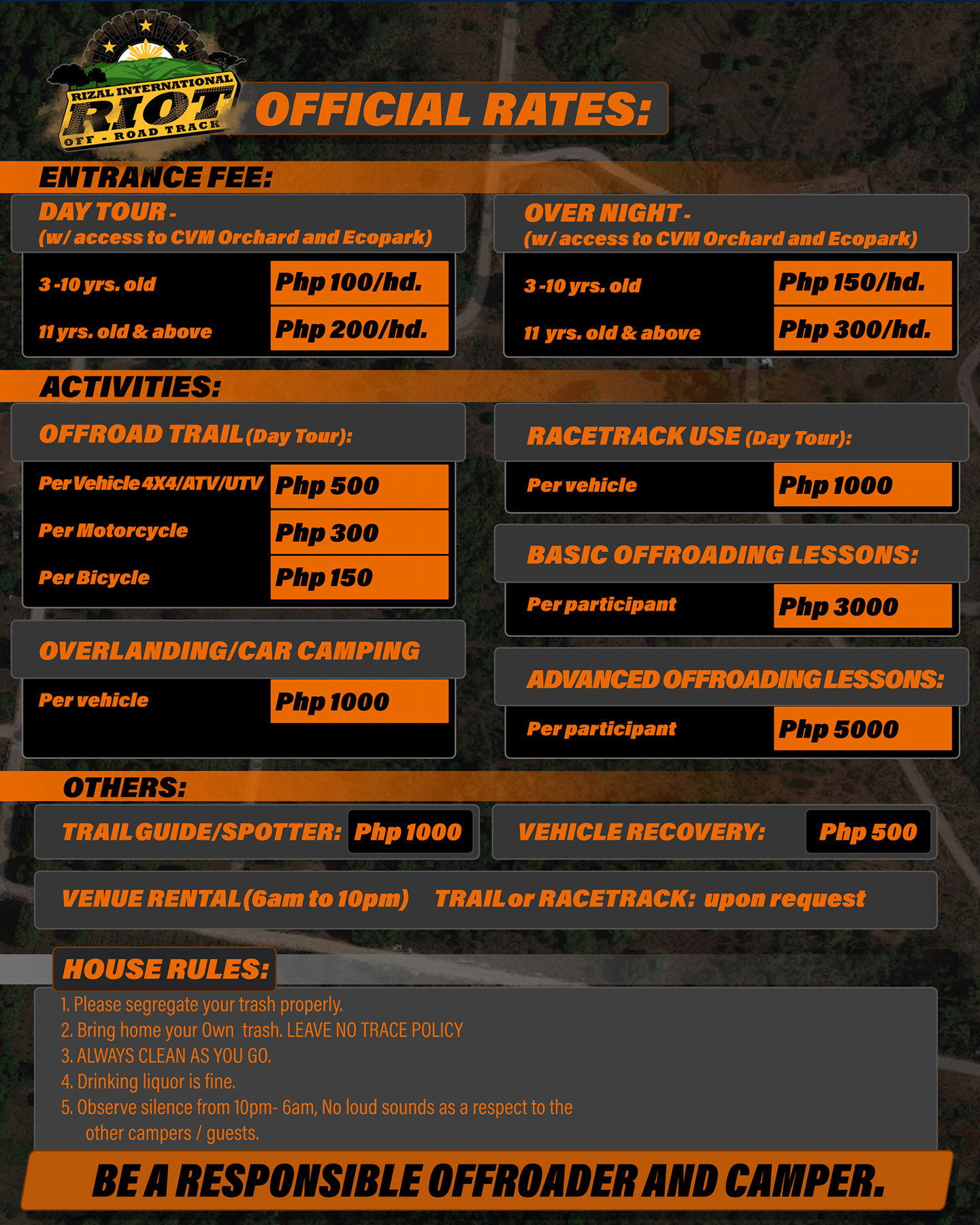 Interested? The entrance fee to RIOT, which includes access to CVM Orchard and Ecopark starts at PHP 100 for kids from 3 – 10 years old and PHP 200 for those ages 11 and up. Take note that doesn't include the price to use the off-road trail, race track, and the overlanding/car camping areas. For a complete list of prices, you may check out the price list above.