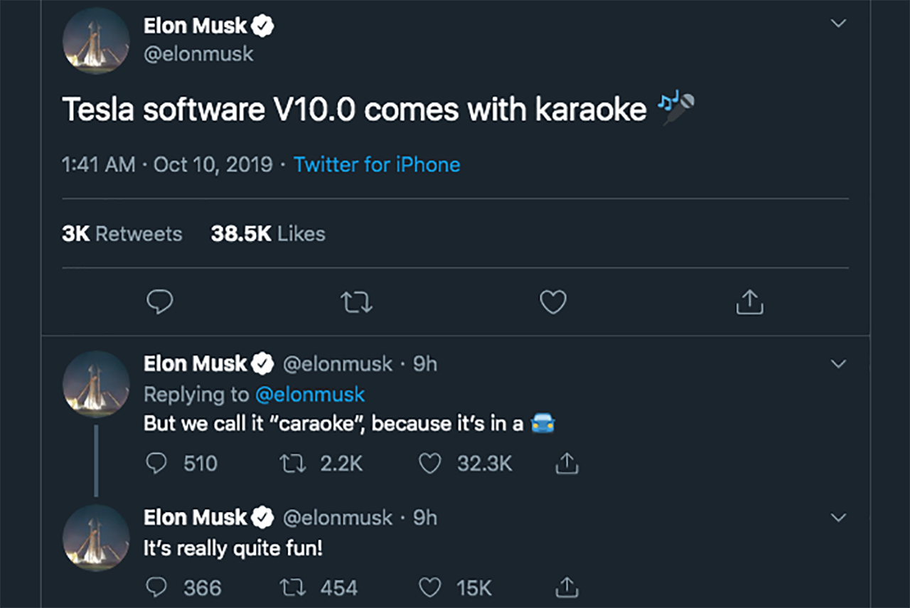The latest update has eight main features. Owners can expect better functionalities from Restaurants & Destination, Music & Podcasts, Security & Convenience, and the added Streaming Media and Browser Support for the Model 3. Four other updates, though, are quite interesting, namely Tesla Theater, Smart Summon, Tesla Arcade, and what Elon Musk himself has seemed to taken a liking to, Car-aoke.