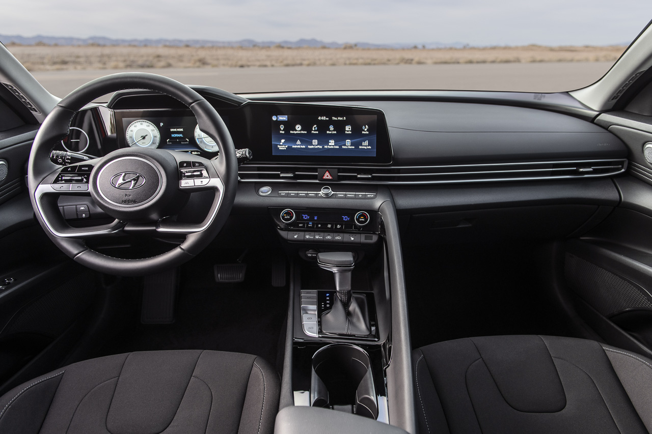 Hopping inside the Elantra, and occupants are immediately greeted by two massive screens. That's because both the instrument panel and the touchscreen infotainment measure 10.25-inches each. Also noticeable is the cocoon-like cabin layout which envelops the driver like an airplane's cockpit. With the high-mounted center console, the driver can easily adjust onboard functions with ease.