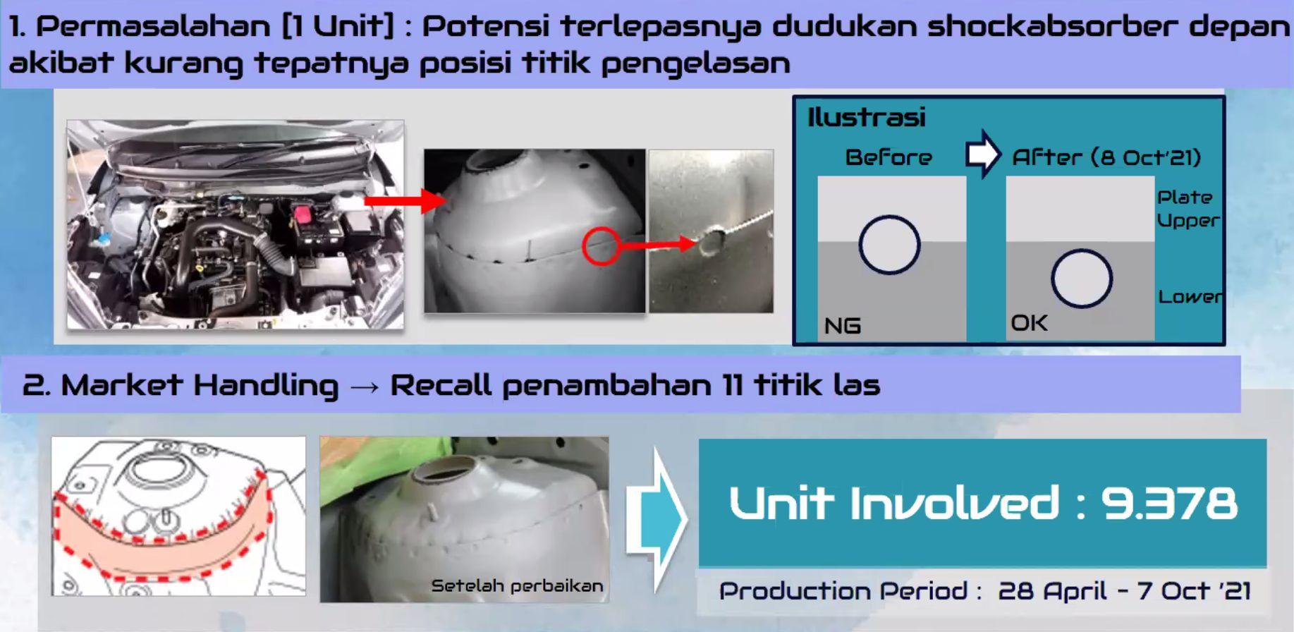 It has been discovered that some units of both models have a problem when it comes to welding, specifically on the shock tower in front. Images from various Indonesian auto websites show that the welds are improper, and can result in a very dangerous failure where the top of the shock mount can shear off.