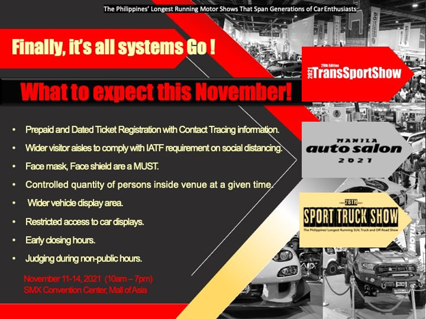 Trans Sport Show, Manila Auto Salon, Sport Truck Show to be held in one event from November 11 to 14, 2021 at SMX Convention Center, Pasay City