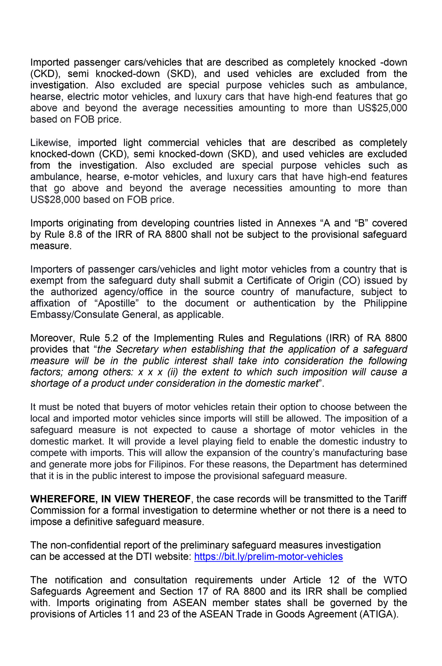 If you noticed we are still unclear as to whether vehicles from these exempted countries are in fact, exempted from the safeguard measure. The reason is that there are some matters that need further clarification. For instance, the DAO says that imports originating from developing countries listed in Annexes “A and “B” covered by Rule 8.8 of the IRR of RA 8800 shall not be subject to the provisional safeguard measure.