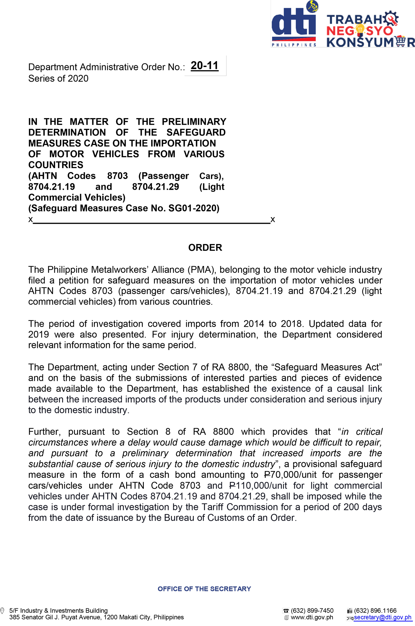 In DAO 20-11, Series of 2020 from the DTI, they made it clear that not all vehicles will be subjected to the safeguard measures. The DTI cited the ASEAN Harmonized Tariff Nomenclature using the AHTN codes; that means vehicles imported under AHTN Code 8703, AHTN Code 8704.21.19 and 8704.21.29 are covered by the safeguard measure.
