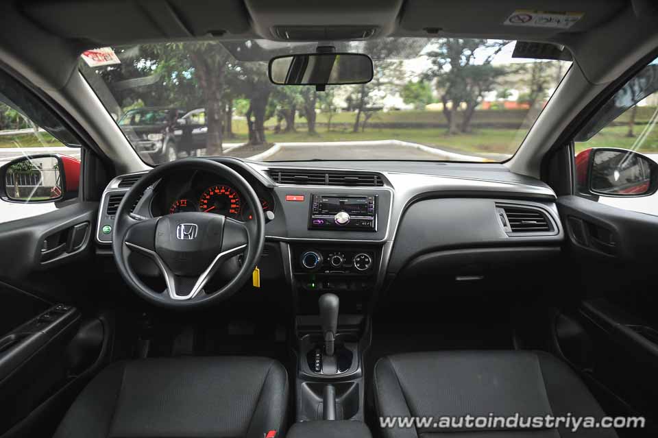 Inside, as expected, isn't as high-end as the City VX+ or even the VX. The dash is clean, but lacks the pizzazz of the TOTL versions such as the gloss black panel, the leather seats, the touch screen audio in favor of a 2-DIN Kenwood audio unit with Bluetooth and USB, and the touch-sensitive climate control panel for a standard set of A/C controls. No matter, as frankly I wasn't that big of a fan of the touch panel; I always kept activating something unintentionally.