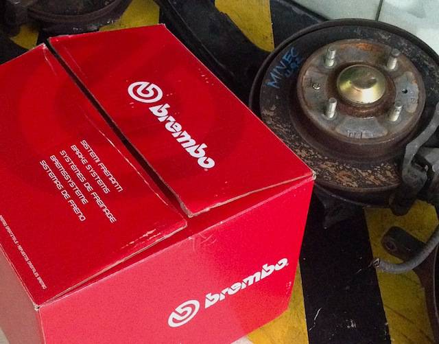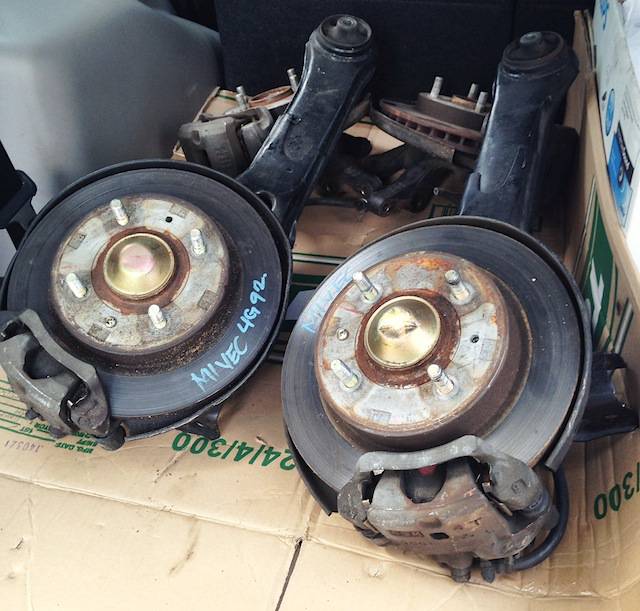 After scouring the many surplus yards and shops of Banawe in Quezon City and Evangelista in Makati, I was finally able to find a set of larger, more powerful brakes for the Lancer CB. The set consisted of 256mm vented discs in front and 260mm solid discs in the back complete with the trailing arms off of the JDM Mirage Cyborg R.