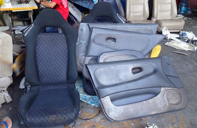 With the front seats acquired and with the rear seats and door sidings removed, I then went to AutoCamp in Ortigas to check out JASC Auto Interiors. A very good reupholstery shop that specializes in restoring interiors to good as new, JASC would replace all the upholstery in black Recaro-style fabrics and with the seams double stitched in red. This goes for the FTO seats, the rear seats and the door inserts. JASC would also refinish the door sidings to the original dark gray.