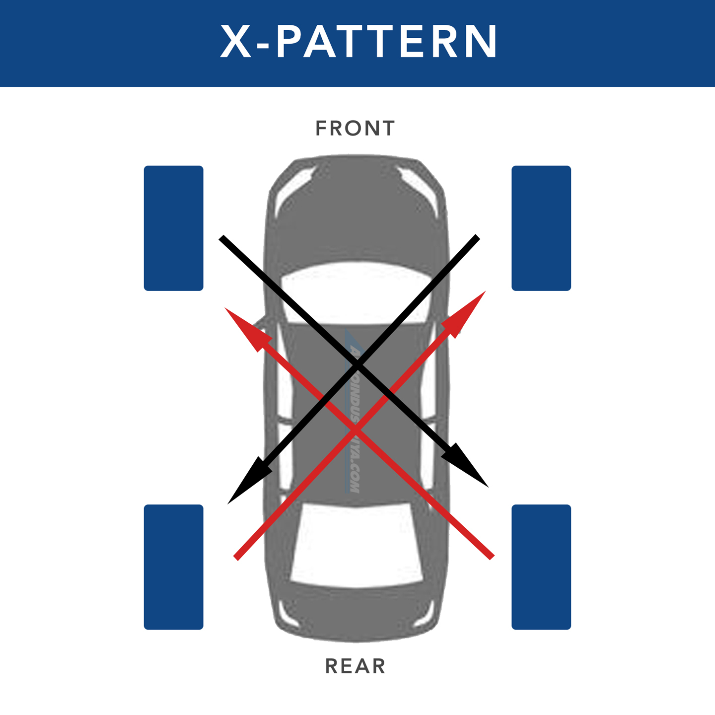 Aside from the Forward Cross method, the X-pattern method can also be used for FWD vehicles. The front tires are transferred diagonally to the rear axle, while the rear tires are moved to the front on opposite sides of the front axle.