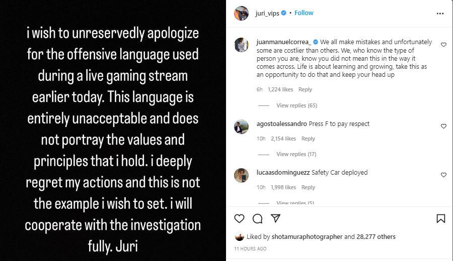 On the other hand, Juri Vips has also expressed his “unreserved apologies” for the offensive language he used during the live gaming stream via a social media post.