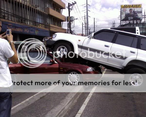 That was quite some time ago na ah, that's my cousin's land cruiser. According the the driver when he started the engine the car just jumped forward. Jumped the railing at Puregold and landed on somebody else's car.